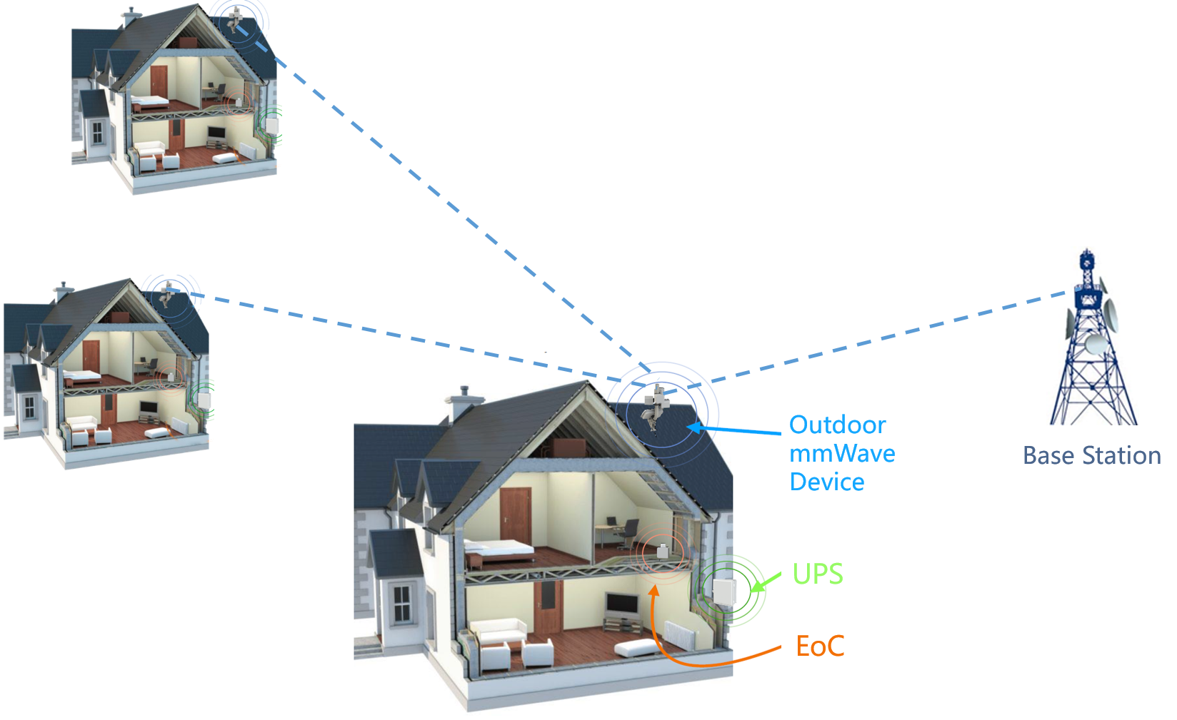 Indoor network signal supplied via the outdoor mmWave device which connected with wireless router and EoC device by cable. The wireless router provides wireless coverage for rooms. The EoC device transmits network signal to each room through the existing cable, then provides the RJ45 wired network signal for each room through the EoC mode.